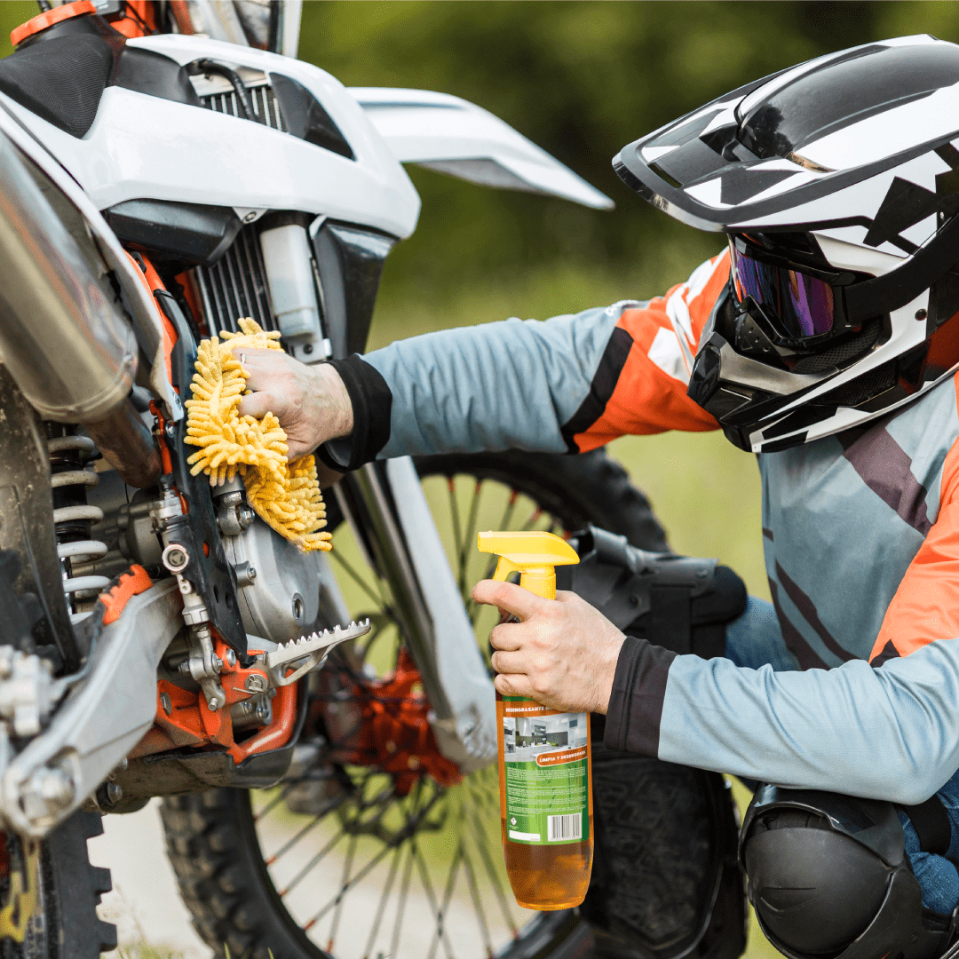 - Rocía el desengrasante multiusos de Drops directamente sobre la cadena de la moto.