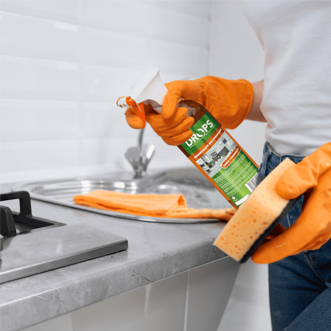 - Prepara una solución de limpieza. Emplea el desengrasante multiusos de Drops. Úsalo puro para superficies con alto contenido de grasa. Úsalo al 10% para otras superficies, es decir 1 medida del producto por cada 9 medidas de agua.